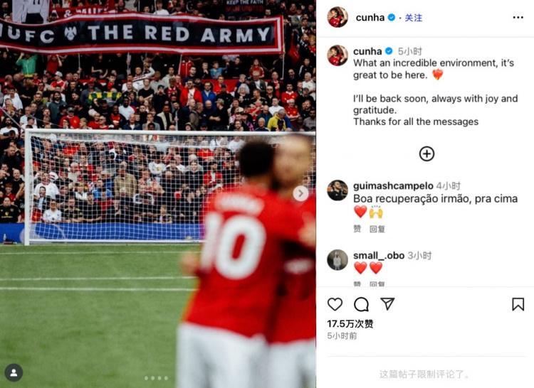 直播吧9月3日讯 在英超第3轮曼联3-2击败伯恩利的比赛中,库尼亚在比赛第31分钟因大腿拉伤提前离场,同时他还退出了本期巴西国家队。今日库尼亚在社媒晒出比赛照等多张照片,并配文写道:“这里的氛围如此之棒!很荣幸能够在此效力。我很快就会归队,在这里的每一刻我都满怀喜悦和感激。感谢你们的留言支...